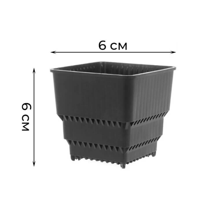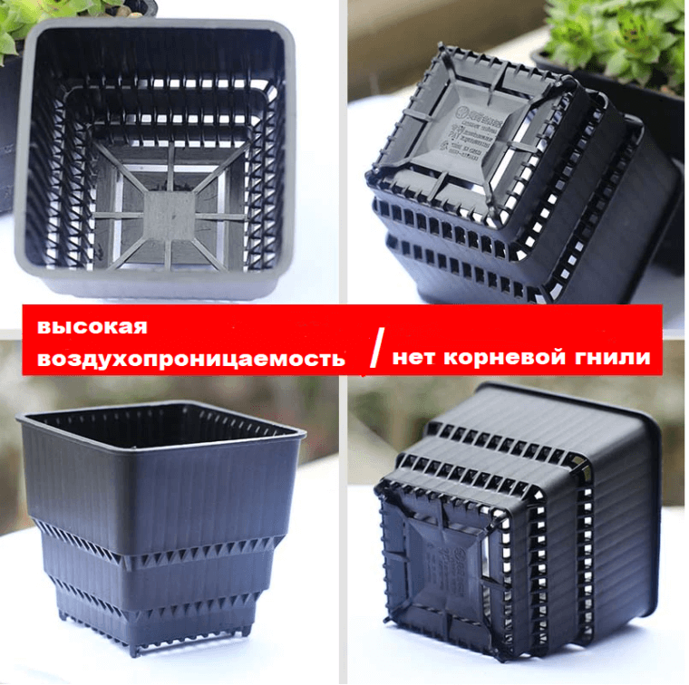 Внутренняя поверхность стенок горшков оснащена продольными выступающими ребрами (слотами), которые предназначены правильно направлять рост корней в субстрат, не позволяя им спутываться или закручиваться. В донце горшка имеются дополнительные дренажные отверстия, отводящие излишки поливочной воды, что исключает загнивание корневой системы растений.