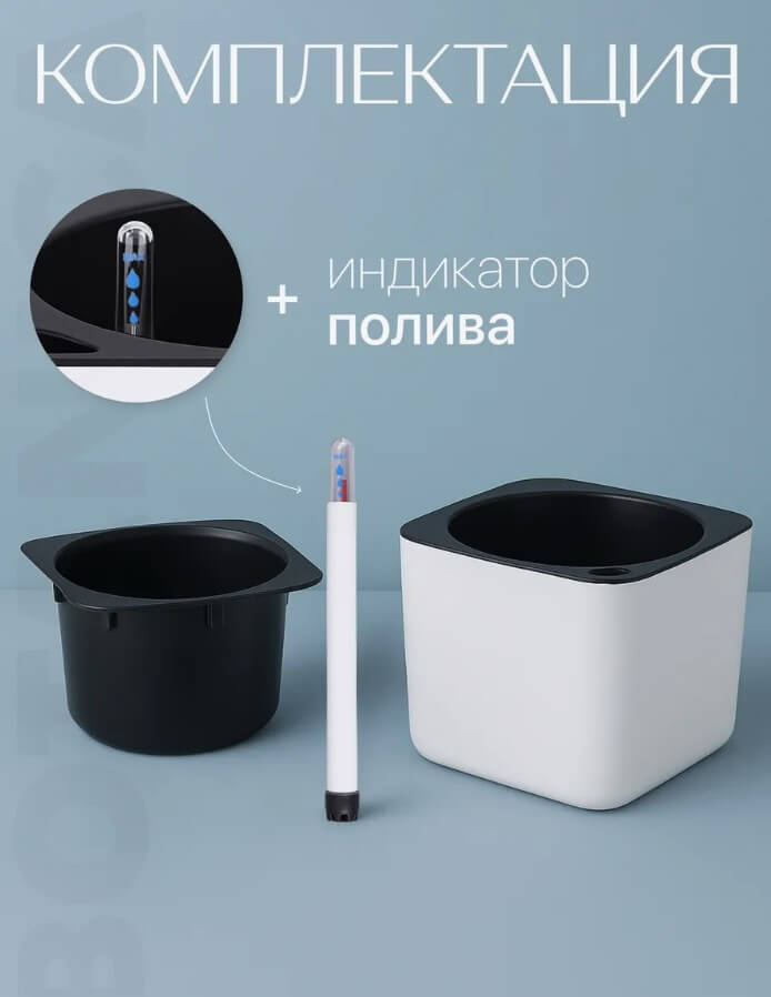 В комплект входит кашпо (внешняя часть), дренажный горшок с прорезями для оптимальной воздухопроницаемости (внутренняя часть), водопроводящий фитиль и индикатор для проверки уровня воды. Благодаря особой конфигурации вазона корни не застаиваются в воде.