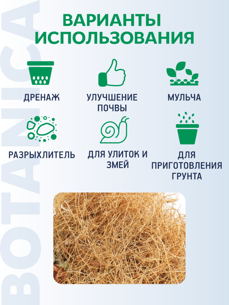 ✅ Резаное кокосовое волокно используется в качестве наполнителя, разрыхлителя почвы, дренажа, и укрытия поверхности почвы в декоративных целях для всех комнатных растений. Рекомендуется для орхидей, имеющих проблемы с корневой системой, т.к. способствует быстрому укоренению.