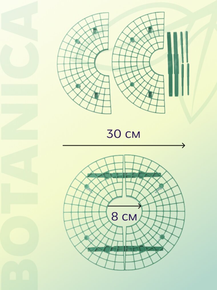 Изготавливается из прочного, легкого и долговечного пластика. Материал устойчив к воздействию ультрафиолетового излучения, влаги, перепадам температур и химическим веществам (удобрениям). Безопасен для растений и окружающей среды, не выделяет вредных веществ.